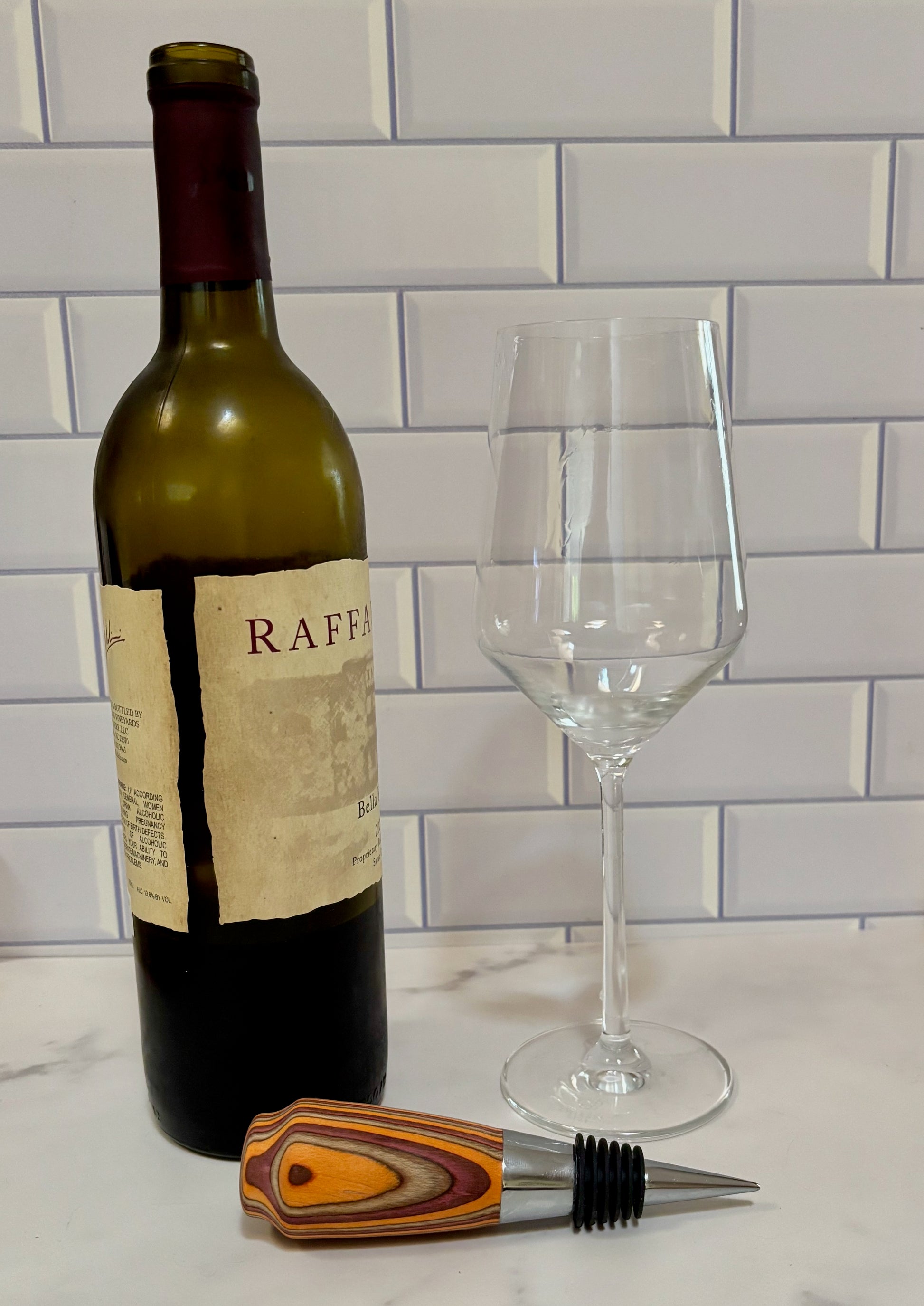 Our bottle stoppers will help preserve that wine for another night or two. All are very unique and therefore listed individually. This one is turned from laminated dyed woods with a chrome stopper.
