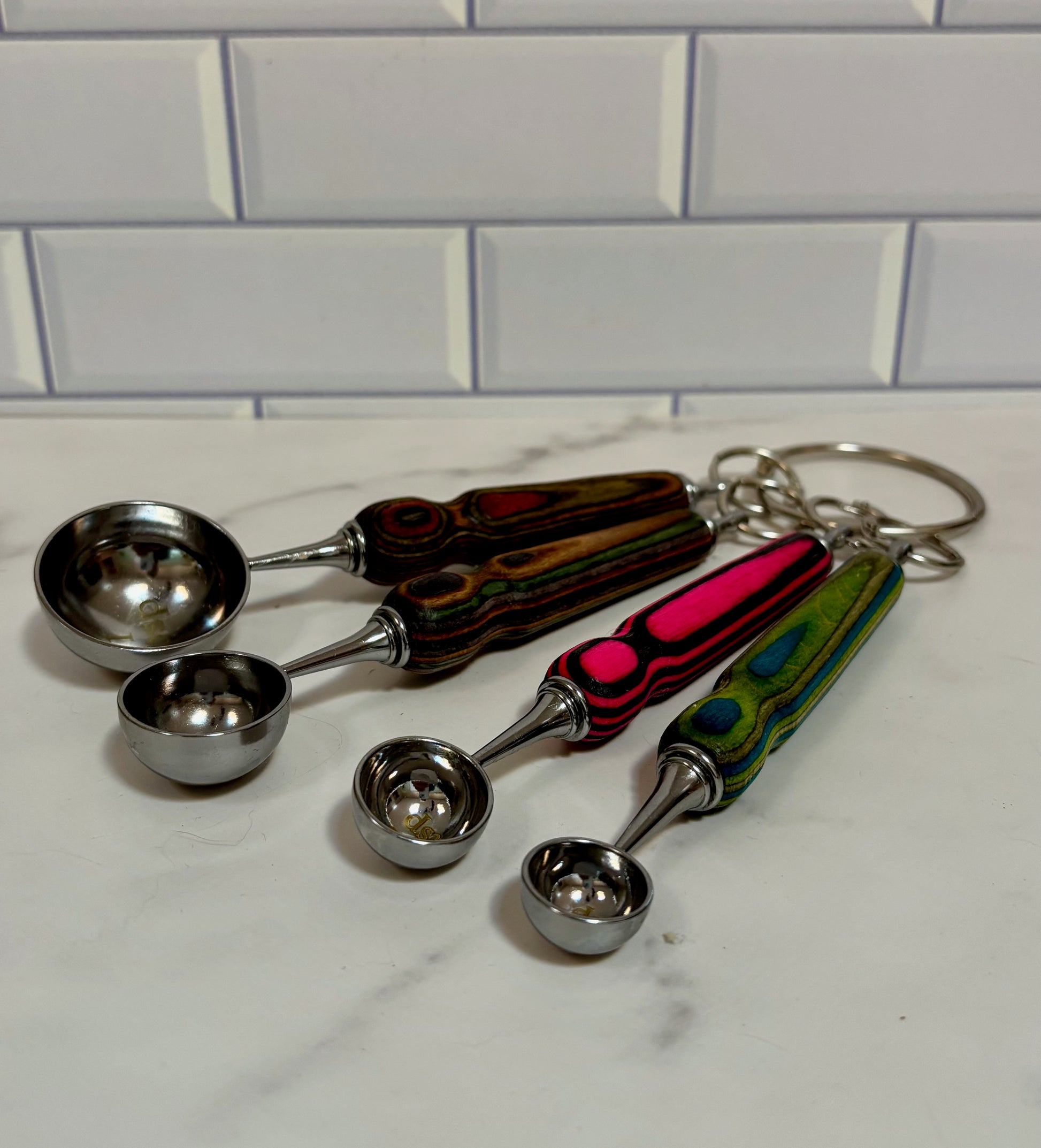 The handles on these spoons are hand turned from laminated dyed woods and assembled with durable chrome kits that all have rings to enable them to be hung or just kept together. There are 4 spoons in the set and the measurements are 1/4, 1/2 and 1 tea spoon and 1 table spoon.